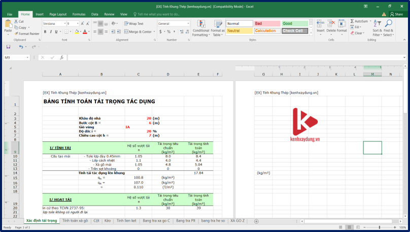 Bảng tính toán khung thép – bảng tính toán tải trọng tác dụng