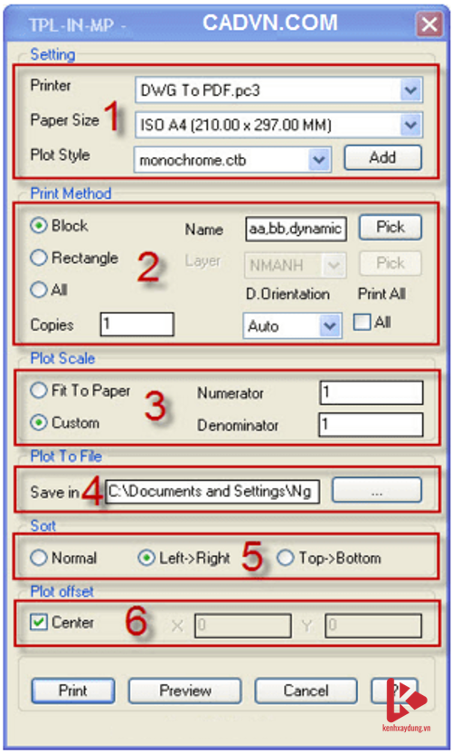 1: chọn tên máy in, khổ giấy, Plotstyle cần in. Nút Add để tải Plotstyle sẵn có mà không trùng với bất kỳ một Plotstyle nào khác.